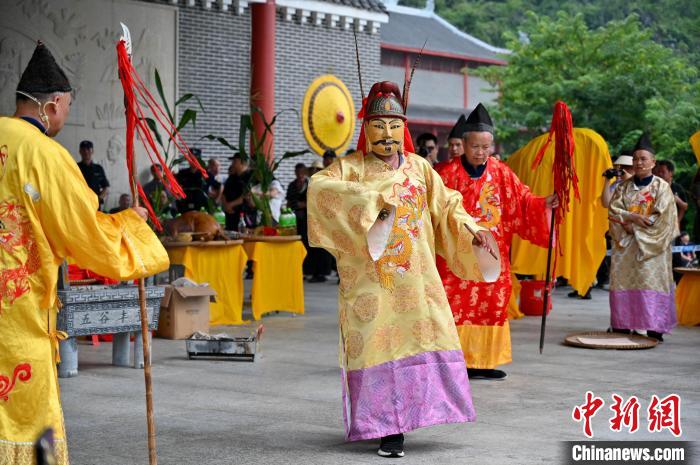 6月21日,中国唯一的毛南族自治县——广西河池市环江毛南族自治县举办传统民族节日“分龙节”。游人欢聚一堂,体验中国毛南族独具特色的民俗文化盛宴。图为分龙节祈福仪式。中新社记者 俞靖 摄