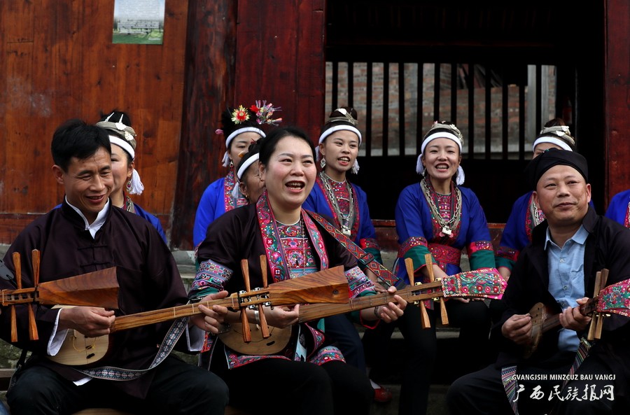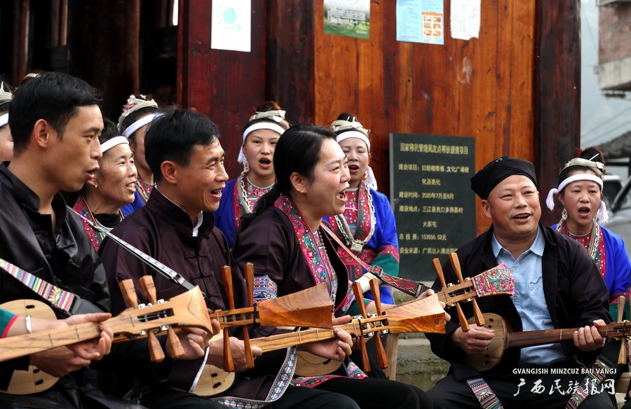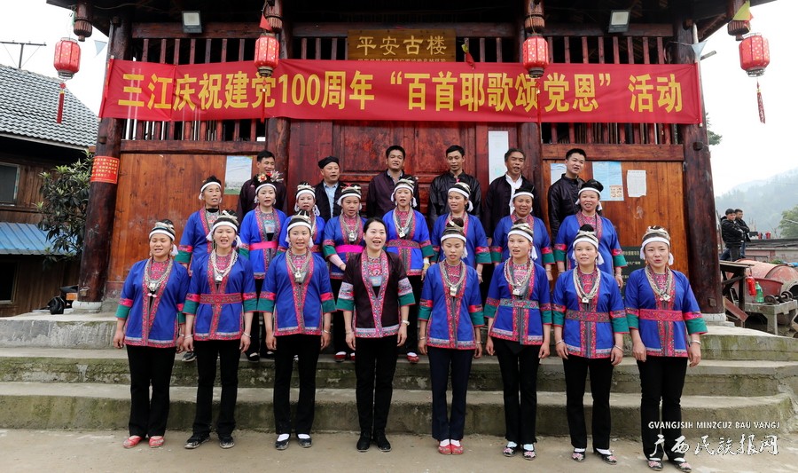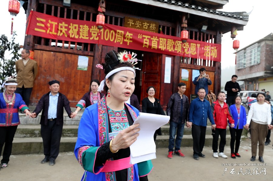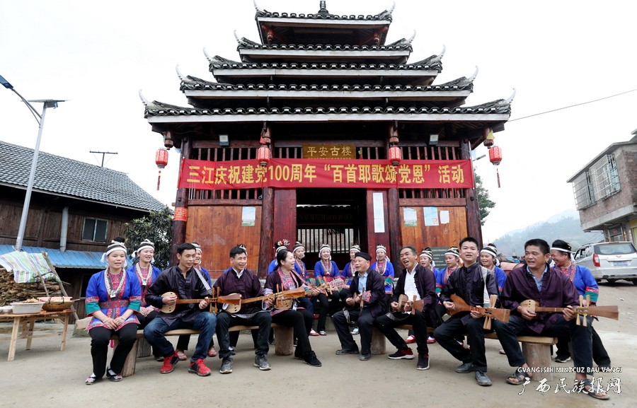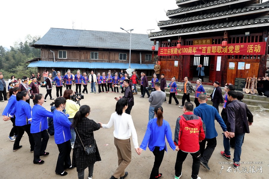 3月17日,三江侗族自治县在该县良口乡燕茶村开展庆祝建党100周年“百首耶歌颂党恩“活动,当地群众通过唱耶歌、弹唱琵琶歌、唱侗族大歌等形式传唱党史和群众的幸福生活,吸引村民前来观看和学习。(通讯员 吴练勋)