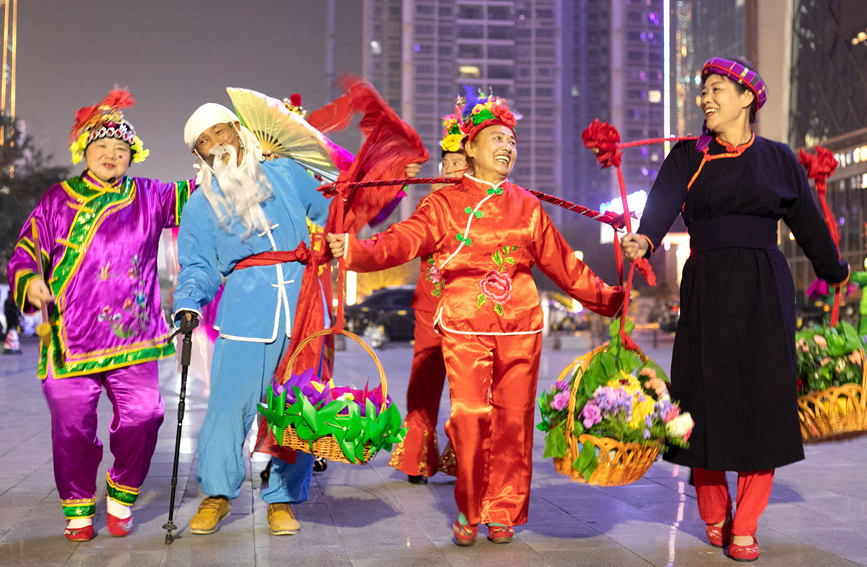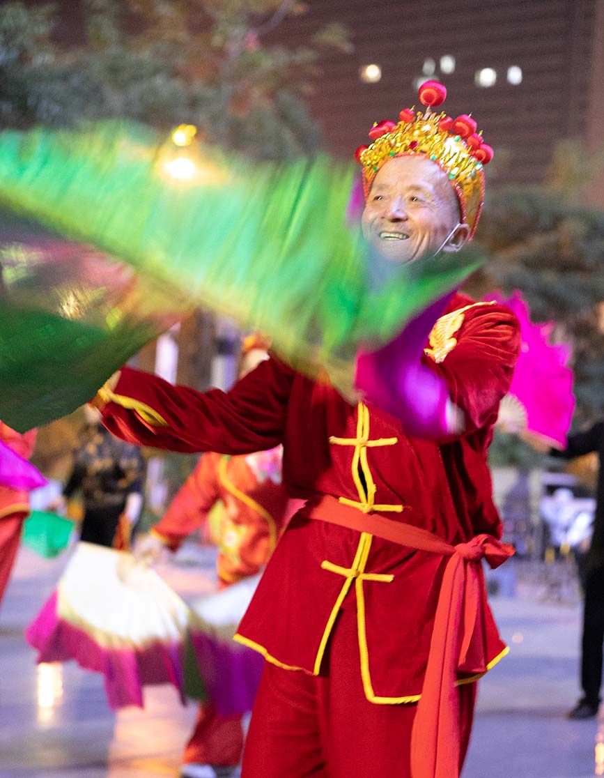 除了伏波文化公园,晚上8点钟,白鹭公园、金地时代广场等地的秧歌队员们,也已经开始扭动起来。