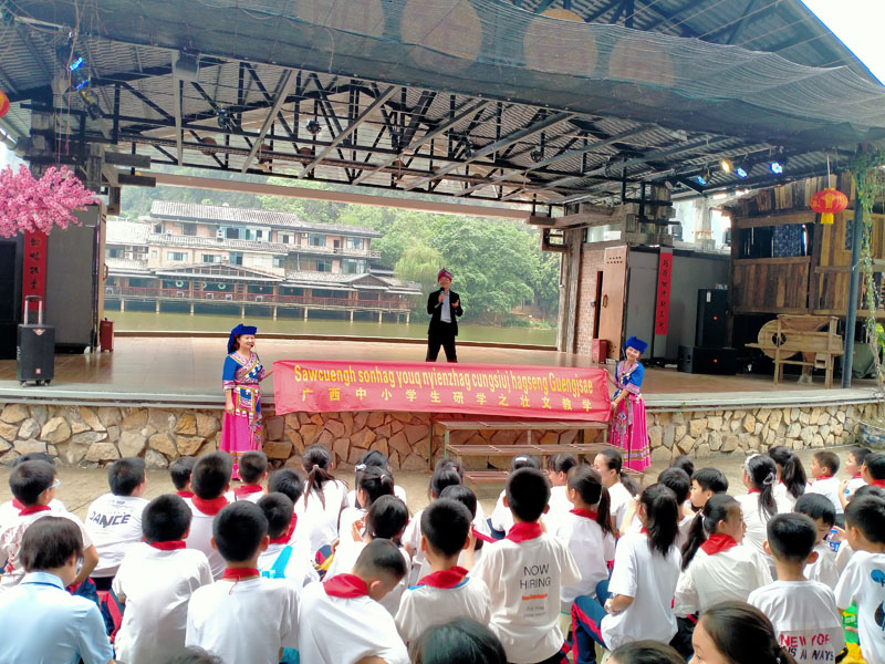 该校学生95%为本地壮族学生,但是仅有30%的同学会壮话,能用壮话交流的只有15%。本次研学活动的主办方邀请了第一批获得壮语文水平考试高级证书、热心推广使用壮语的陆海德老师给同学们上壮语课。