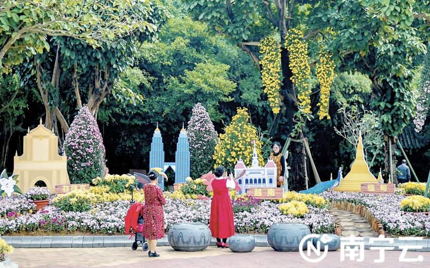“东盟国家建筑“元素与菊花共同组成的园林小品别具异域风情。
