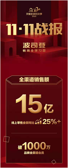 据官方数据显示,双十一活动期间,波司登天猫旗舰店10月21日第一波预售首小时就登上了本土服饰类男装、女装排行榜的首位,全渠道销售额突破9亿元。此后,在后续的周期内依然稳居本土服饰类品牌销售冠军宝座,在服饰品牌类销售榜单中位居行业第二。截至11月11日23时59分,波司登品牌全渠道销售额突破15亿元,品牌全渠道会员破1000万。