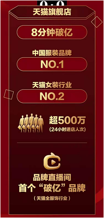 此外,双十一期间波司登单日直播观看量达到了356.45万,直播时长在天猫服饰商家自播排名中位列行业第一,还实现了真正的24小时不间断直播。波司登也成为天猫双十一活动中大服饰类直播种草成交额唯一破亿的直播间。
