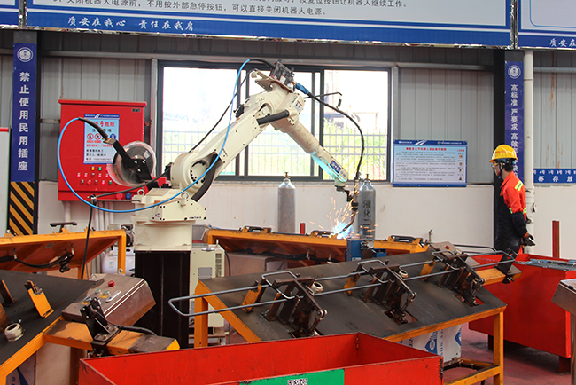 亮点工程之一全自动焊接机器人,可设置各种程序对不同钢筋焊接质量要求控制精准,免去人工焊接的繁杂工序,有效提高焊接加工质量。每天综合加工钢筋数量15T,人工每天焊接综合数量为10t,提高50%的焊接效率,且焊接质量大大增加。桥面铺装预埋门字筋、盖梁骨架及相关钢筋的连接均可采用全自动CO?保护焊机器人进行焊接,确保钢筋焊接质量,可以在空间中各个面之间相互转换加工,能适应各种复杂的工况,四个操作平台同时使用,大大提高了焊接机械人的使用效率。