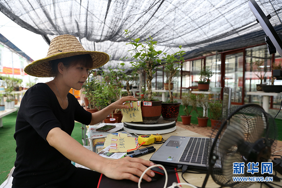 农户在横县校椅镇榃汶村茉莉花盆栽和蔬菜育苗扶贫示范园利用直播平台销售茉莉花盆栽。新华网 刘君摄