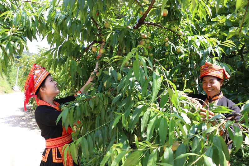 村民正在将摘好的油桃装车。