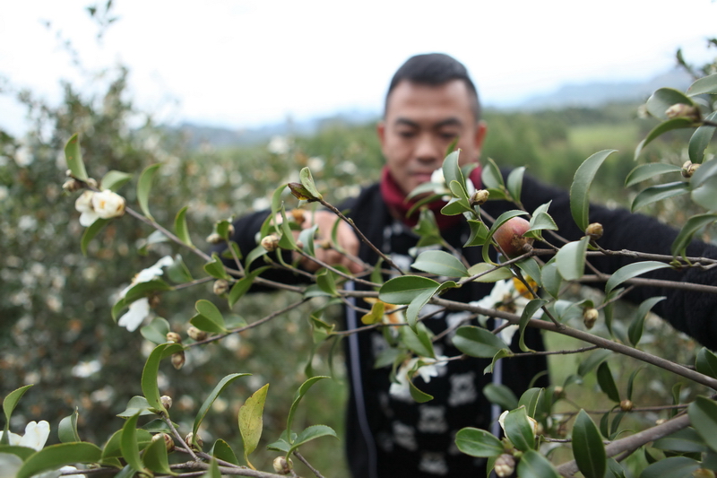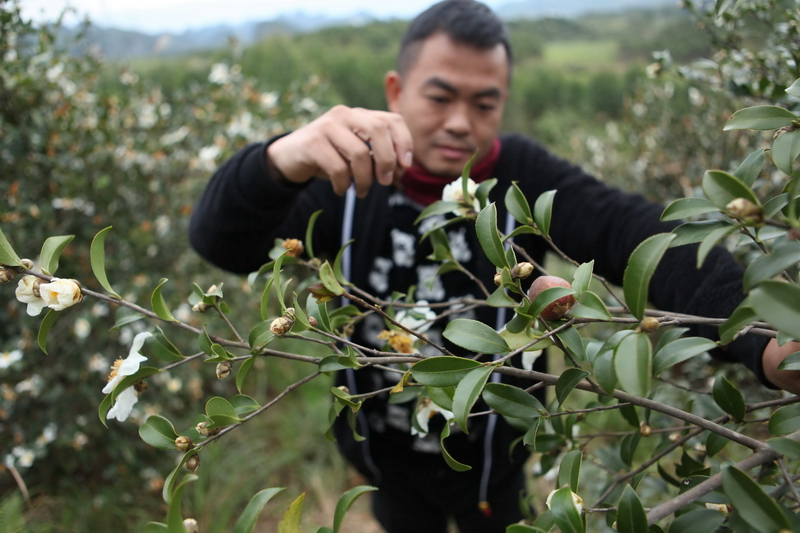 12月3日,在柳州市融水苗族自治县融水镇东良村陆村屯,拍摄到一片油茶丰收的景象。时下,正是当地油茶花盛开,村民采收茶子、压榨茶油的季节。(廖子渊)