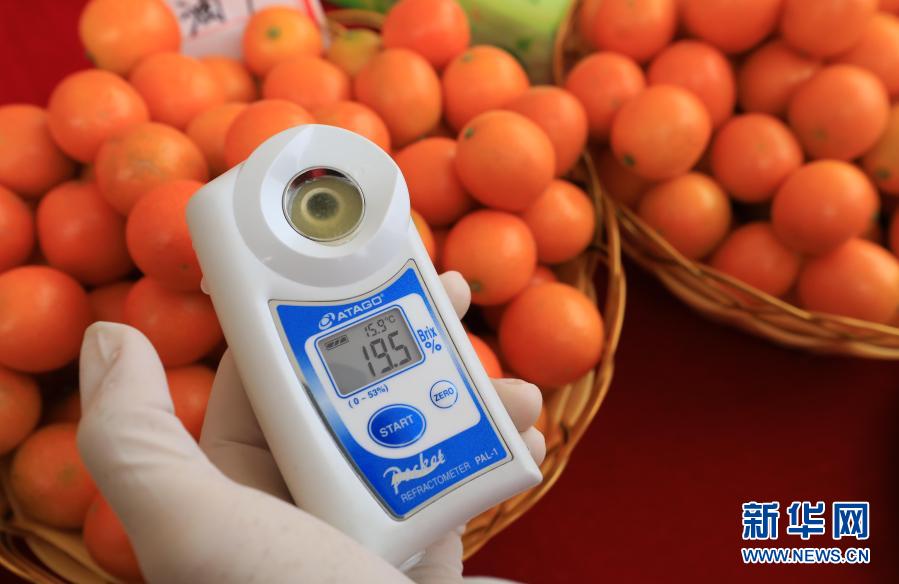 12月12日,在广西柳州市融安县“金桔选美“比赛现场,评委测量参赛金桔的含糖量。新华社记者 黄孝邦 摄