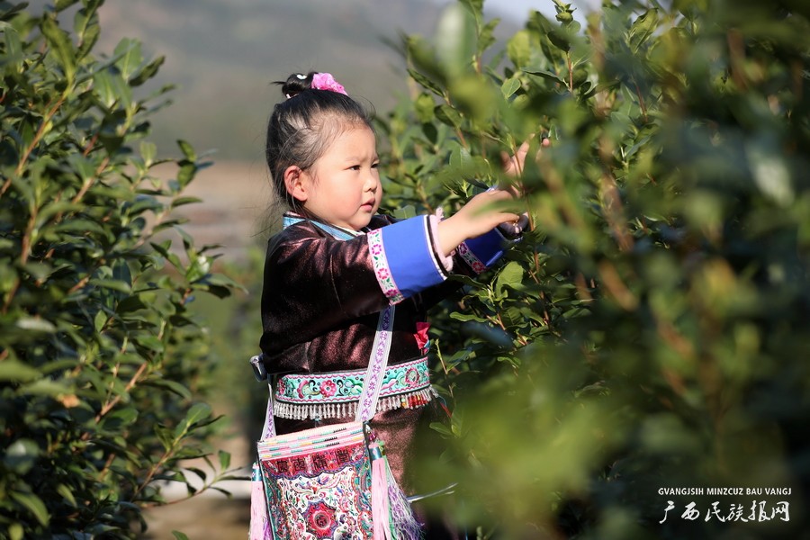 1月19日,一名小女孩在三江侗族自治县梅林乡车寨村平寨屯茶园基地采摘新茶。