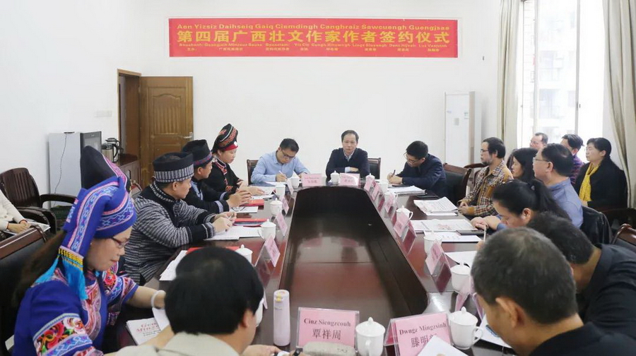 3月26日,第四届广西壮文作家作者签约仪式在南宁举行,主办单位广西民族报社与5位壮文作家作者签订了为期一年的合作协议。自治区民宗委副主任翚永红出席签约仪式并讲话。中国民族语文翻译局壮语文室、自治区民宗委民族语言文字处、 广西民族语文研究中心、 广西少数民族古籍保护研究中心、广西民族理论政策研究室、 广西民族出版社、三月三杂志社、广西民族高中等从事民族语文工作的兄弟单位主要负责人及专家学者、广西民族报记者编辑30多人参加了签约仪式,并就壮文作家作者培育及新时代壮文事业发展进行研讨。