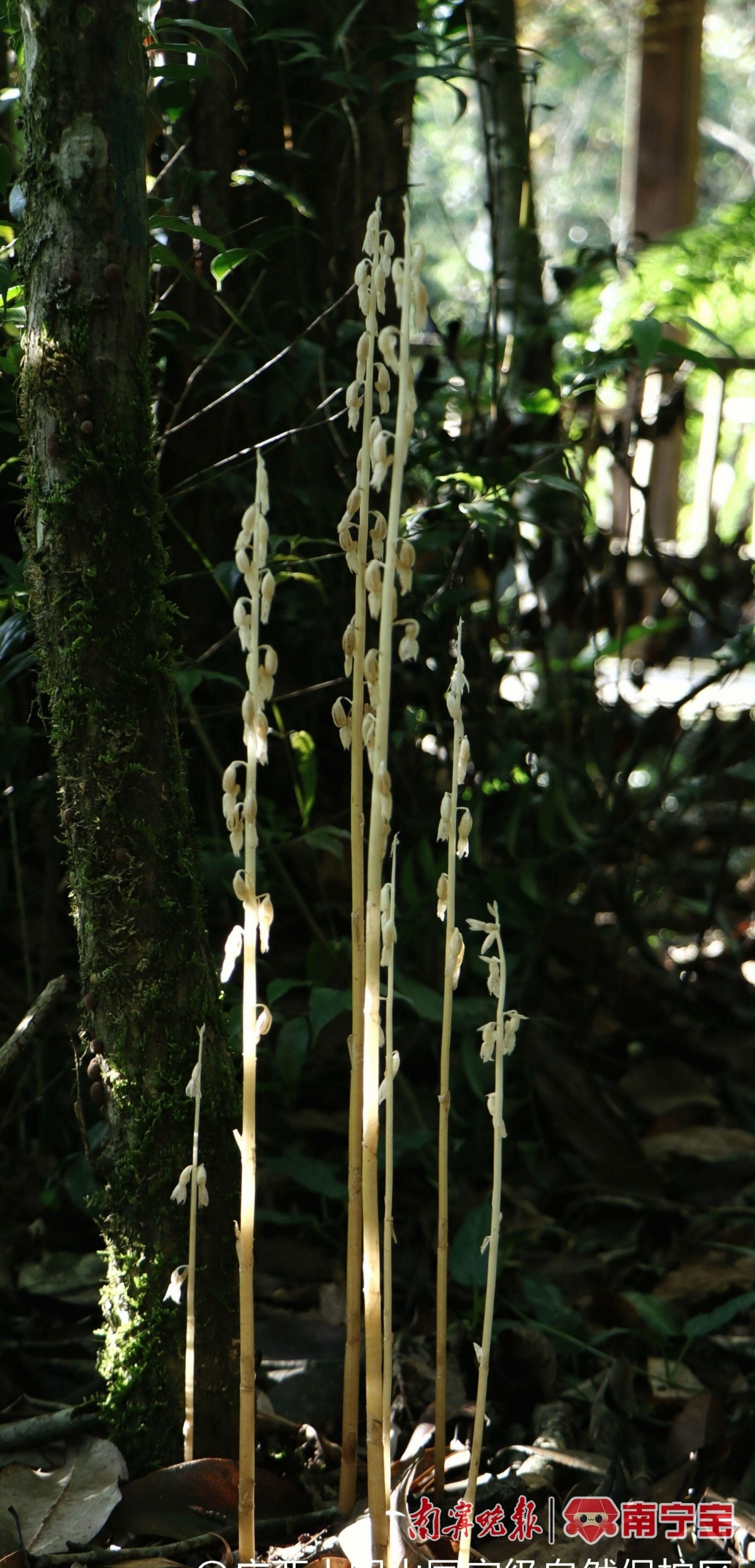大明山保护区护林员介绍称,此处生态环境土地肥沃松软且富含腐殖质,空气湿度大且空气流通。花束亭亭玉立,洁白发亮,上有粉紫色斑纹。其中7株围绕在一起,仿佛在开家庭会议。