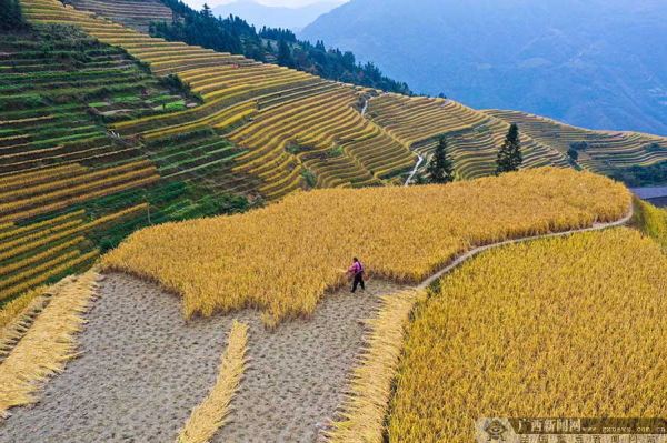 广西新闻网龙胜10月26日讯(通讯员 潘志祥 实习生 李蔚霞)10月26日,广西桂林市龙胜各族自治县龙脊镇所辖的平安村、大寨村、龙脊村种植的水稻进入收获期,村民们抓住晴好天气收割水稻,梯田上处处是人们忙碌的身影。 村民在梯田上收割水稻。广西新闻网通讯员 潘志祥 摄 村民在梯田上收割水稻。广西...