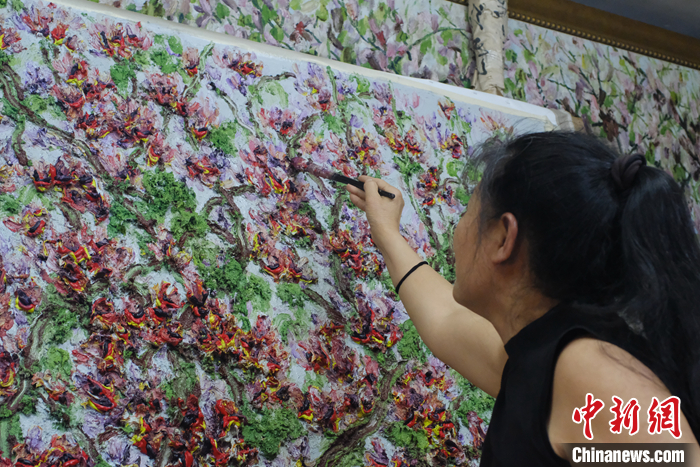 近期,广西柳州市近30万株洋紫荆竞相开放。该市的大街小巷被大片的洋紫荆包围,宛如一片“粉色海洋”。在画家林建莉的工作室内,她正站在椅子上,用画笔肆意描绘着一幅巨型的洋紫荆油画。