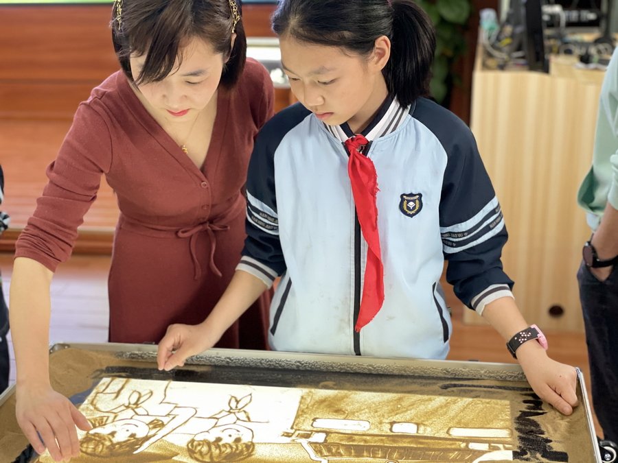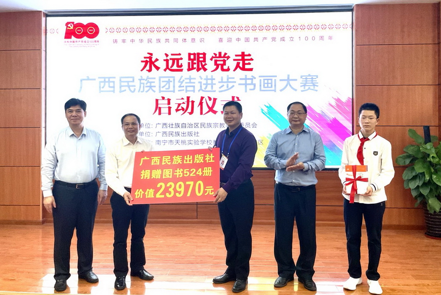在活动现场,南宁市天桃实验学校翠竹校区师生通过通过沙画表演、歌舞节目、现场书法、绘画长卷等多种方式,向建党100周年献礼。同学们现场绘制的书画作品递交组委会成为此次大赛的首批参赛作品。自治区民宗委、广西民族出版社还向天桃实验学校师生赠送了500多册图书,价值23970元。