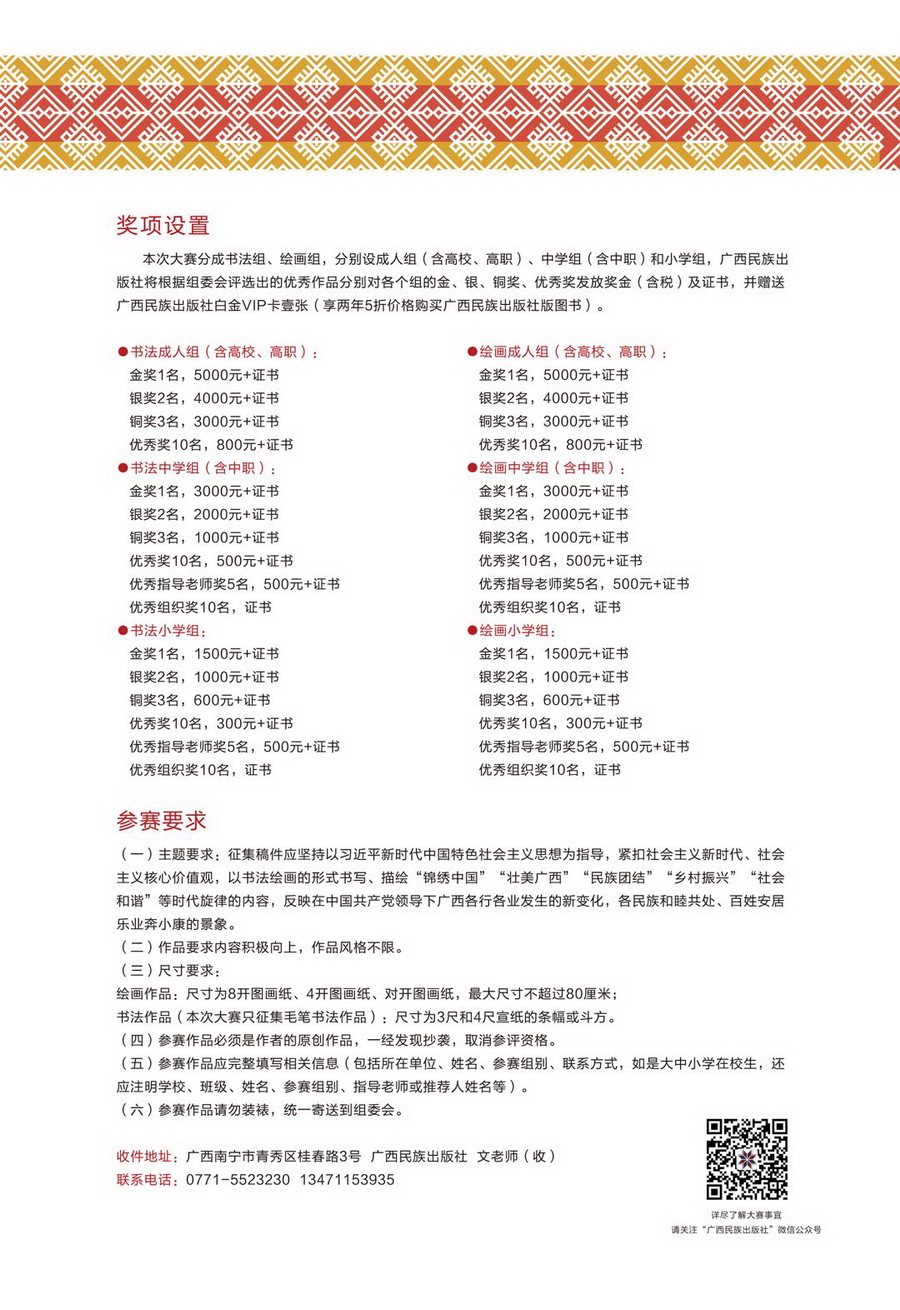 仪式上,广西民族出版社社长兼总编辑石朝雄介绍了大赛的筹备情况。此次书画大赛于2021年4月12日启动,6月30日截稿,7月份评奖。大赛将面向全社会公开征集,通过征集“锦绣中国““壮美广西““民族团结““乡村振兴““社会和谐“等时代旋律,反映在中国共产党领导下,我国我区各行各业发生的新变化,展现各民族和睦共处、百姓安居乐业奔小康的优秀书画作品。作品分为书法组和绘画组,分别设有成人组(含中职、职高)、中学组和小学组,各设金、银、铜和优秀奖,总奖金达11.66万元。