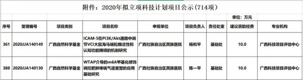 近日,广西壮族自治区科学技术厅发布的《2020年广西壮族自治区本级财政科技计划拟立项项目公示》显示,经申请人申报、主管部门推荐、专业机构组织专家评审、厅长办公会审议等流程,广西民族医院有2个项目荣获自治区科技厅面上项目立项,分别是:全科医学科主任陈一平的《WTAP介导的m6A甲基化修...