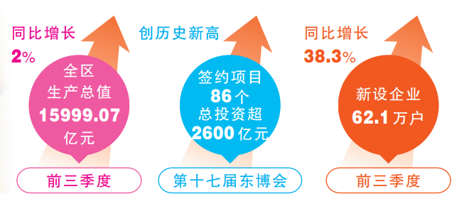 基础设施跨越式发展。全区固定资产投资保持稳步回升态势,1—10月同比增长3.1%。基础设施投资同比增长10.4%;制造业投资加快恢复,增长4.8%;高技术产业投资同比增长23.9%。