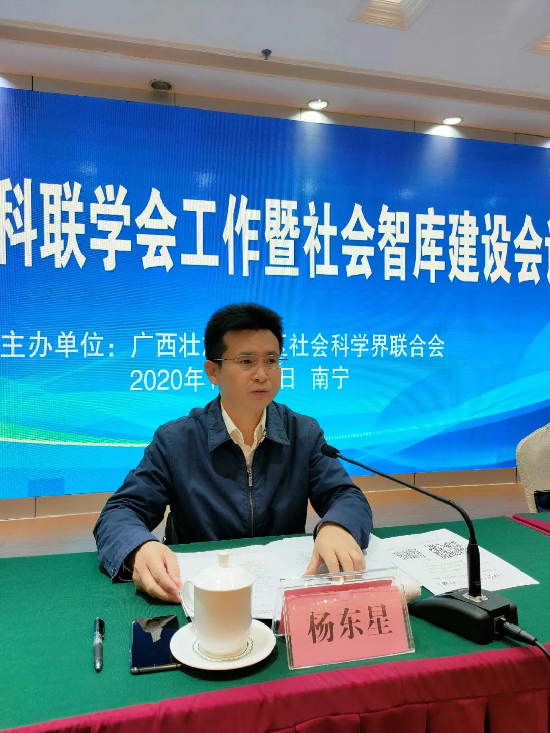 2020年12月10日,自治区社科联学会工作暨社会智库建设会议在南宁举行。自治区社科联党组成员、副主席杨东星出席会议并讲话。自治区社科联定点联系服务社会组织联络员和党建工作指导员,自治区社科联各社会组织主要负责人120多人参会。会议由自治区社科联二级巡视员刘俊主持。