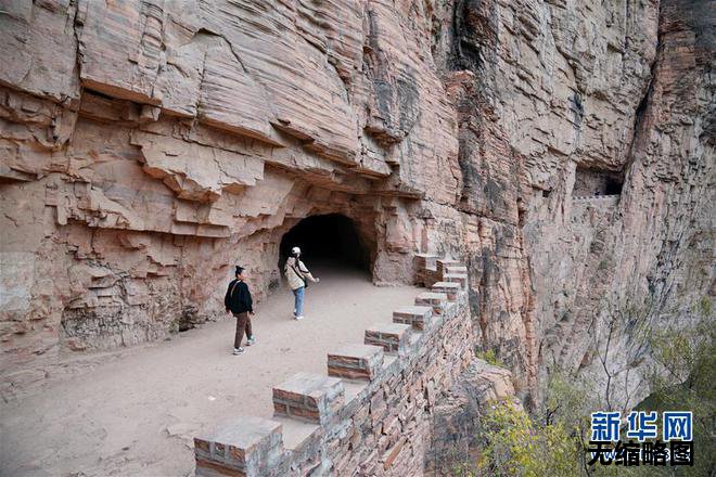 游客在峡沟村“挂壁公路“游览。新华社记者 牟宇 摄