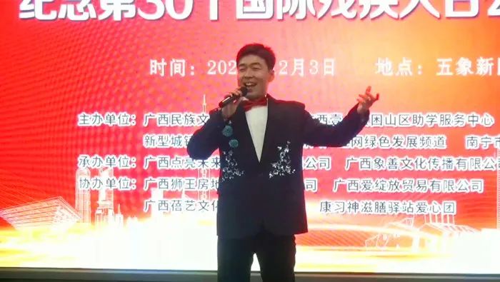 令人无比感动的是,当天晚会的现场,一位充满传奇的残疾人榜样向大家分享了他人生的起起落落:一场意外车祸导致他成为了一年半的植物人,靠年迈七旬的慈祥父亲,用宽厚朴实的辛勤双手和永不放弃的父爱,照顾躺在床上4年多的他,让他再次学会了站起来,再次学会了走路,学会做人,学会感恩……更令人奇的是,他还做到了让更多健全人去敬佩学习的榜样——连续发起和组织了纪念国际残疾日公益活动。他就是《牵手同行点亮未来——2020年12月3日纪念第29个国际残疾人日》《民族文化点亮未来——2021年12月3日纪念第30个国际残疾人日》发起人、总导演、广西点亮未来文化传媒有限公司创始人吴春树。在分享自己的传奇故事过程中,他还特别对巴马康喜神健康科技开发有限公司董事长、康习神滋膳驿站创始人支为民,广西爱绽放贸易有限公司创始人、董事长何馨妍表示感谢,并邀请他们上台和他一起分享相关爱心故事。