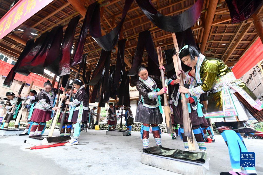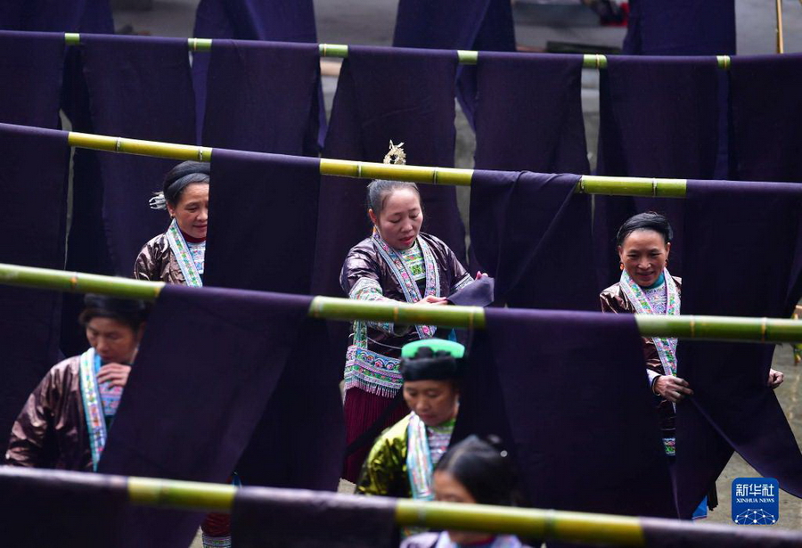 亮布是当地苗族传统手工布料,制作要经过浸染、捶打、晾晒和涂蛋清等多道工序。亮布制成后可长久保持光泽。因制作工艺复杂、耗时长久,传统亮布曾一度淡出人们的视野。近年来,随着文旅产业的发展和传统文化的复苏,传统亮布制作技艺重现生机。