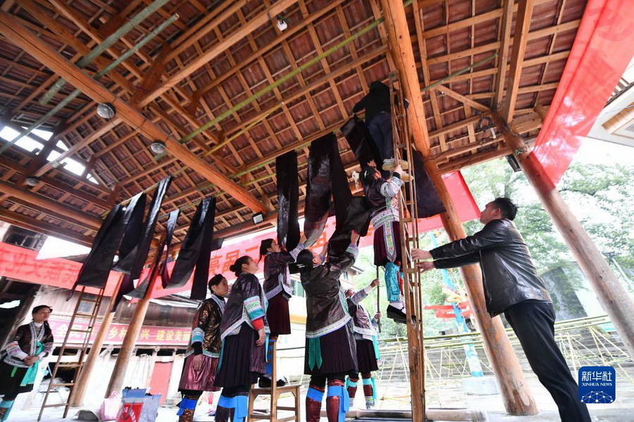 10月19日,在桂黔乌英苗寨亮布文化节上,苗族妇女在悬挂亮布。