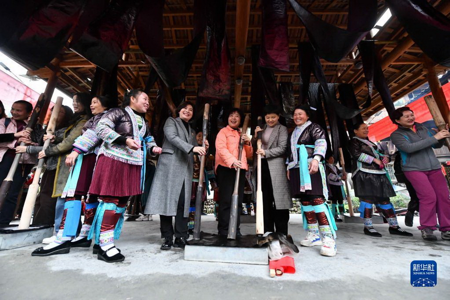 10月19日,在桂黔乌英苗寨亮布文化节上,柳州女企业家和苗族妇女一起体验捶打亮布。