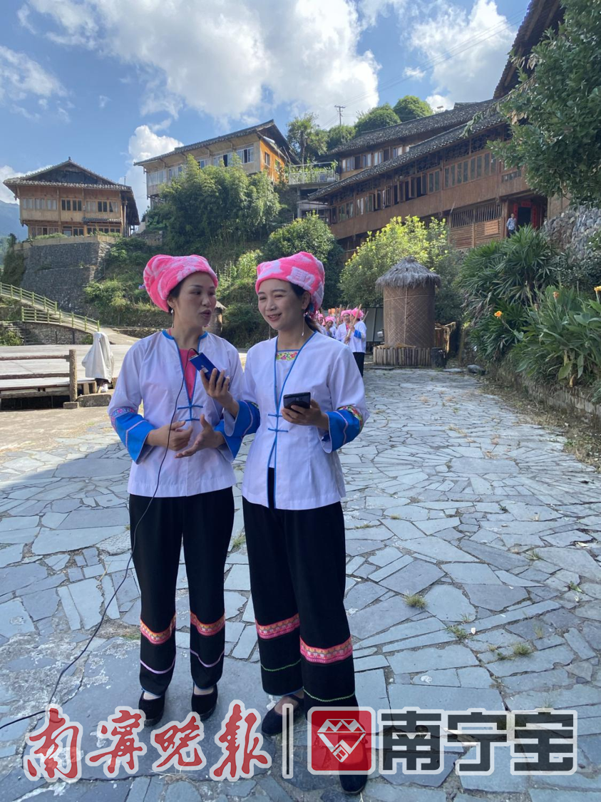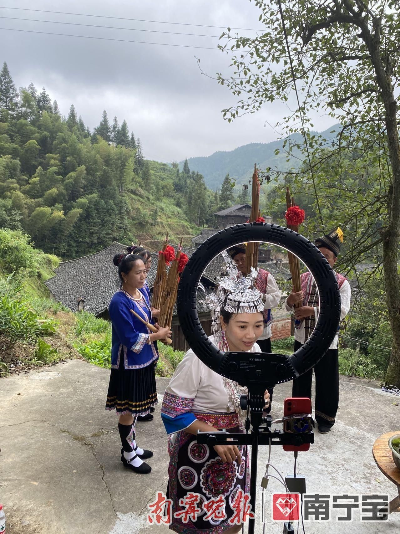 蒋凤(中)在龙胜地灵侗寨直播芦笙表演