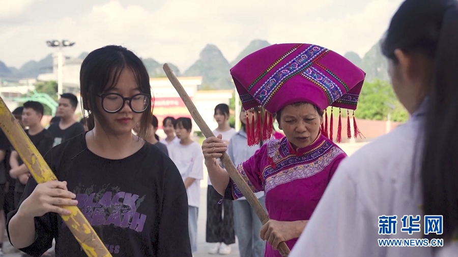 覃素芳在教学生练习“壮族打扁担“