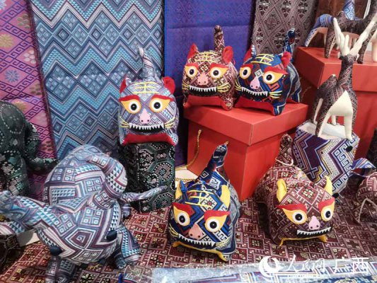 壮锦饰品。人民网 黄子婧摄 人民网南宁12月27日电(王勇 黄子婧)12月24日,中国广西国际轻工业投资贸易博览会轻工消费品展在南宁国际会展中心开幕。 活动为期三天,共展出广西2000多款优质轻工消费品,品类涵盖纺织服装、生活用品、特色美食、土特产、茶酒佳酿、新能源汽车、特色年货、工艺品、家...