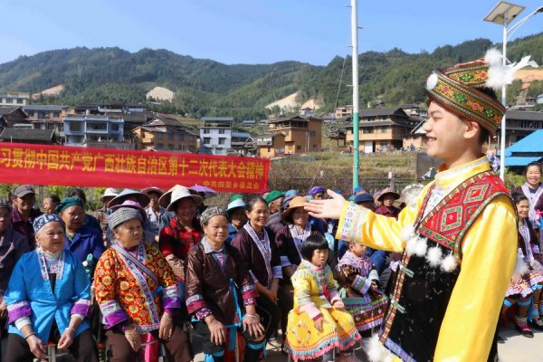 11月30日,在柳州市融水苗族自治县四荣乡东田村小东江屯,村级宣讲员李世乾在宣讲中国共产党广西壮族自治区第十二次代表大会精神。 11月30日,在柳州市融水苗族自治县四荣乡东田村小东江...